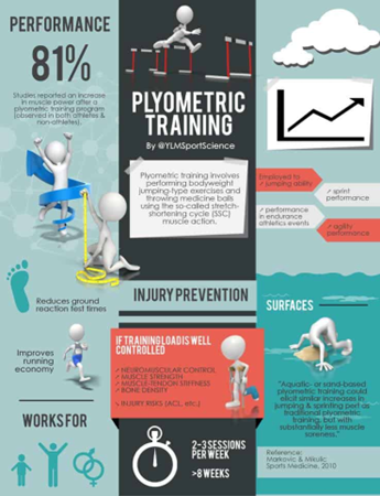 Plyometric training, otherwise referred to as ‘plyometrics’ or ‘shock training’, is a training modality which often requires athletes to jump, hop, bound and/or skip. Plyometrics should not be confused with ‘ballistic’ training, which is ultimately another word for ‘trajectory’ training. Ballistic training involves the trajectory of objects and implements (e.g. barbells and medicine balls), whereas plyometric training uses the previously mentioned movements.